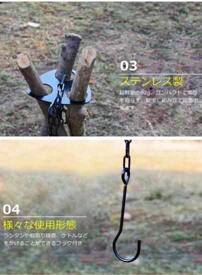 *焚き火に使うのはもちろん、ランタン、小物の吊り下げとして、キャンプ、ピクニック、バーベキューに活用できます。