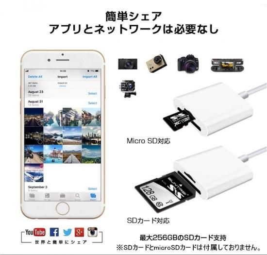 SDカードリーダーとmicroSDカードでデジタルカメラの写真やビデオをiPhone、iPadまで伝送できます。